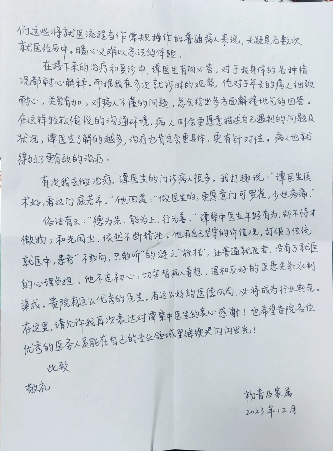 譚醫生表示,楊女士的認可和贊揚是他的榮幸,更是對他今后工作的鞭策。他說(shuō):“為患者提供最好的醫療服務(wù)是我作為醫生的職責。我很高興能收到楊女士的表?yè)P,但我認為這更是一種鼓勵和肯定,我會(huì )更加努力工作,不辜負患者的期望?!?/p>