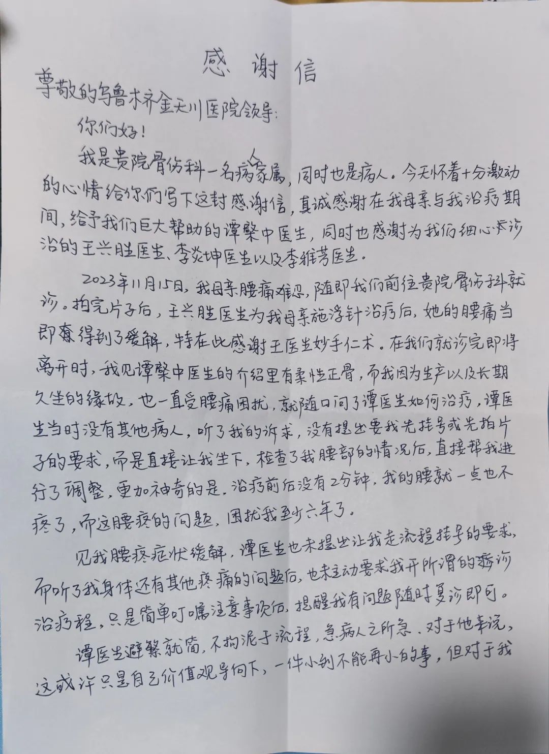 2023年12月28日,一位患者將一面寫(xiě)有“精醫重道仁心仁術(shù),和光同塵與時(shí)舒卷”的錦旗和一封表?yè)P信送到烏魯木齊金天川醫院,以此表達對金天川醫院骨傷科譚棨中醫生及王興盛醫生、李炎坤醫生、李雅芳醫生精湛醫術(shù)和貼心服務(wù)的感激之情。這面錦旗不僅是對骨傷科醫生們的個(gè)人褒獎,更是對烏魯木齊金天川醫院對患者的優(yōu)質(zhì)服務(wù)和診療質(zhì)量的肯定。