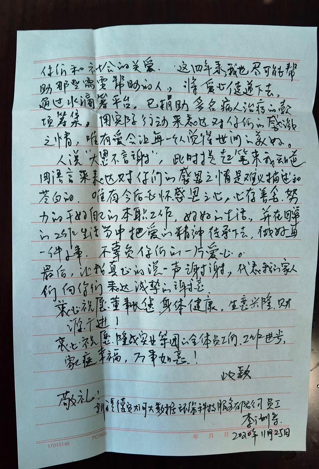 2020年11月27日,集團公司接到一位來(lái)自“金雪馳愛(ài)心基金”幫扶者(新疆德安大河大數據環(huán)??萍挤?wù)有限公司員工)李先生的登門(mén)答謝。