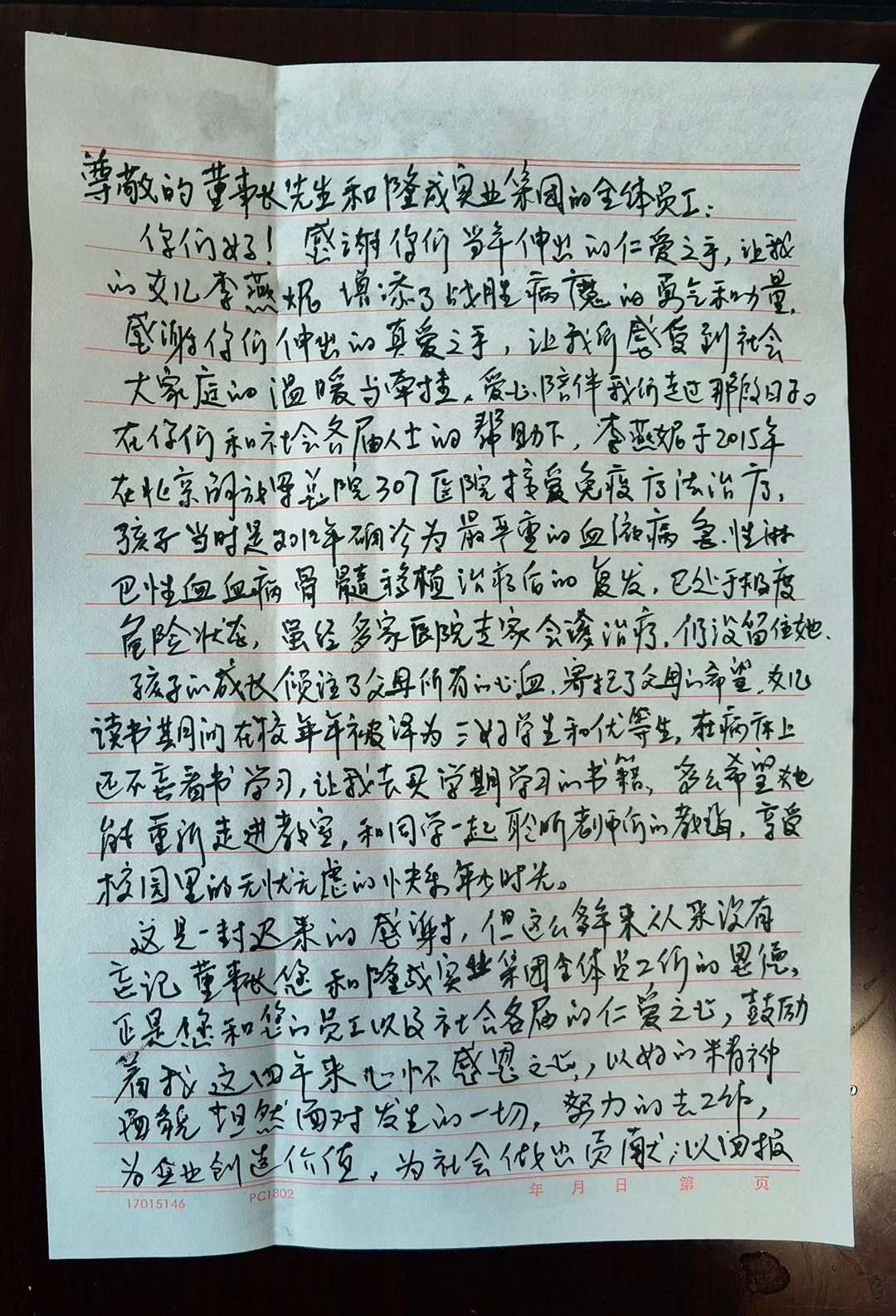 事由:金雪馳愛(ài)心基金于2012年援助了李先生,李先生女兒在2012年被確診為白血病,曾接受骨髓移植后又復發(fā),2015年在北京解放軍總院接受治療時(shí)已處于極度危險狀態(tài),隨后經(jīng)過(guò)多家醫院的專(zhuān)家會(huì )診治療,最終還是沒(méi)能將孩子的生命挽救回來(lái),當年在求醫路上接受到“金雪馳愛(ài)心基金”的捐助,一直對董事長(cháng)劉輝先生和隆成實(shí)業(yè)的全體員工存有感恩之心,今日登門(mén)拜訪(fǎng),并送上感謝信和答謝禮。董事長(cháng)親切的接待了李先生也回贈于他金雪馳紀念品,董事長(cháng)對李先生女兒的遭遇表示不幸,并表示了隆成集團對他的幫助是我們做企業(yè)人的社會(huì )責任,也希望“金雪馳愛(ài)心基金”今后能夠幫助到更多的人和事。