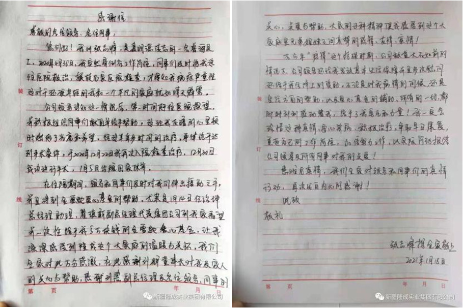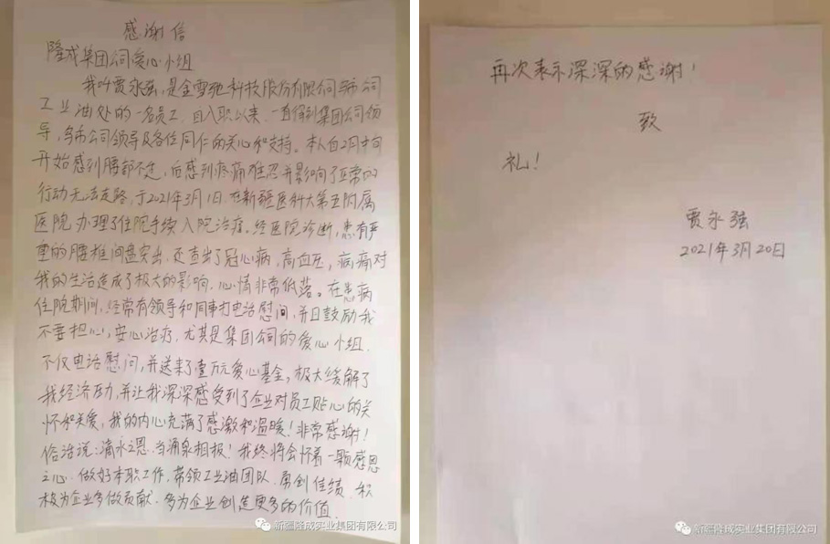 新疆金雪馳科技股份有限公司烏魯木齊分公司工業(yè)油處處長(cháng)賈永強,自2021年3月1日起,因身體抱恙,住院治療,據了解身體情況較為嚴重(腰間盤(pán)突出、冠心病、心臟驟停)。家中父母年邁均退休,父親癱瘓在床多年,家中還背負著(zhù)房貸,作為家中的勞動(dòng)力和頂梁柱,壓力巨大。賈永強對工作恪盡職守,悉心教導帶領(lǐng)的隊伍,對處室人員起到了積極的模范帶頭作用。他堅守崗位,直到做好后續工作交接才放心去住院治療。愛(ài)心基金小組深入了解情況后,相關(guān)部門(mén)積極跟進(jìn)愛(ài)心基金捐助工作,于2021年3月19日向正在接受住院治療的賈永強電匯金雪馳愛(ài)心基金10000元。希望他積極接受治療,好好養病,早日康復出院,重回工作崗位,回歸隆成大家庭。